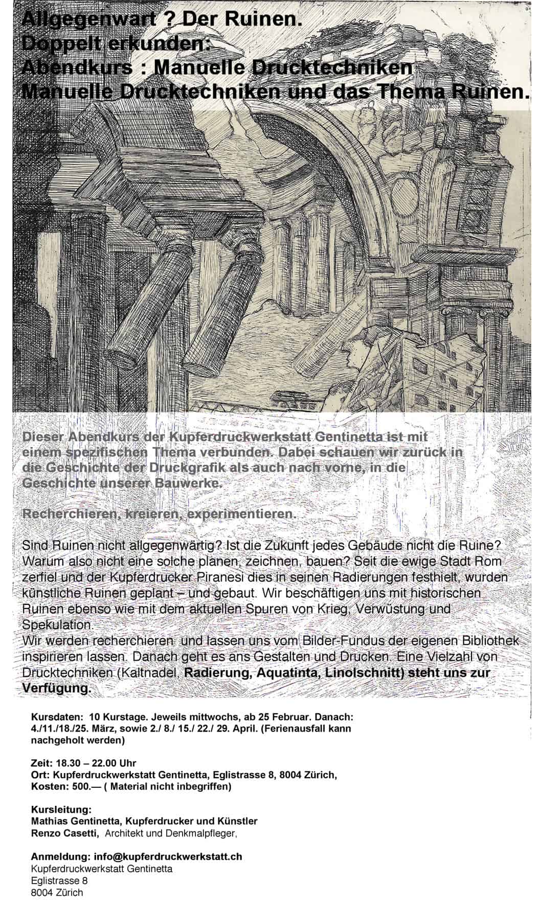 Dieser Abendkurs der Kupferdruckwerkstatt Gentinetta ist mit einem spezifischen Thema verbunden. Dabei schauen wir zurück in die Geschichte der Druckgrafik als auch nach vorne, in die Geschichte unserer Bauwerke.