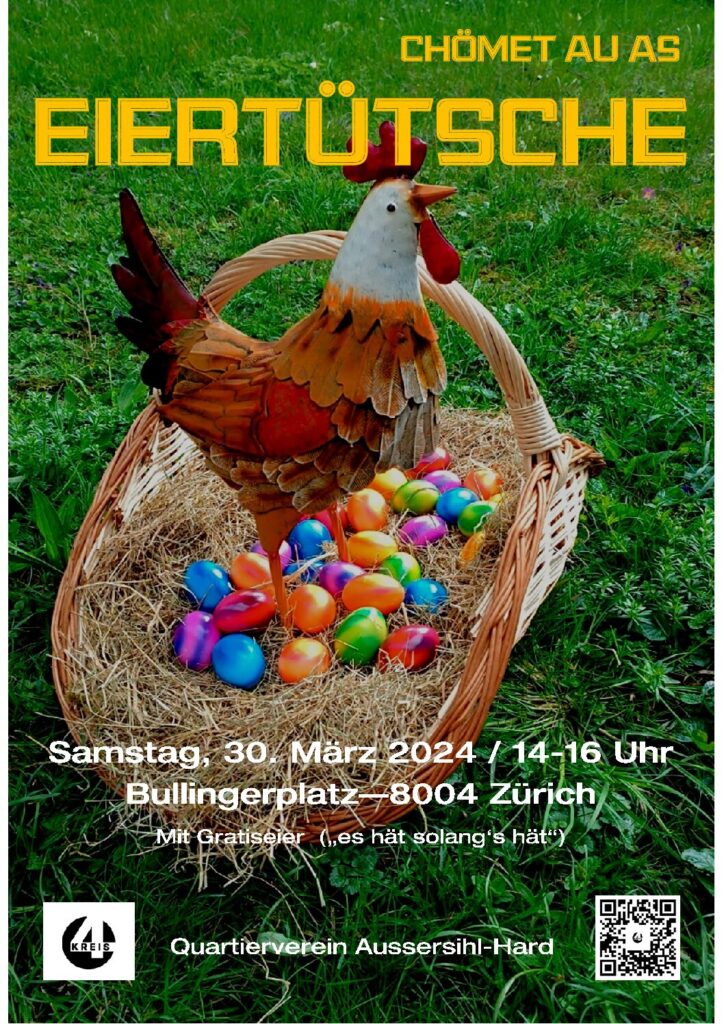 Möchten Sie auch Eiertütschen? Besuchen Sie uns am Bullingerfplatz. . Flyer Eiertütsche Spielregel: Zwei Menschen schlagen zwei hartgekochte Eier aufeinander und wer die Schale des andern beschädigt, gewinnt.” Mit diesen kleinen Tricks kannst Du gewinnen: – Nimm ein kleines Ei, die sind stabiler als grosse. – Treffe die Ei-Spitze des Gegners möglichst…