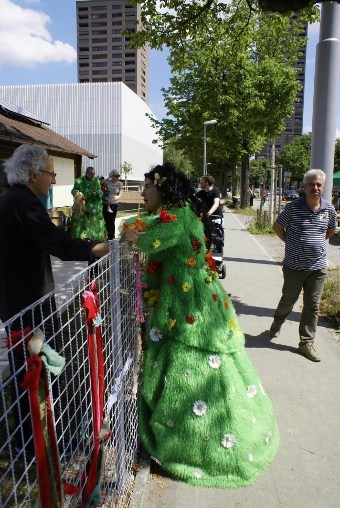 Mit einem kleinen Festakt um 14 Uhr wurde der Garten dann offiziell dem Verein übergeben. Nach diversen Reden schnitt Levi, unser jüngstes Mitglied, die Kokosschnur durch, Herr Maurer von Grün Stadt Zürich kleidete sich in ein exclusives Feigenblatt-T-Shirt und mit einer kleinen Feigenbaum-Plantage wurden die ersten Pflanzen in unsren Garten gepflanzt. Diese Feigenbäume sind übrigens Abkömmlinge jener Bäume, die auch vorher schon auf dem Areal wuchsen, als hier noch Kleingärten waren. GSZ nahm viele Stecklinge von diesen Bäumen.