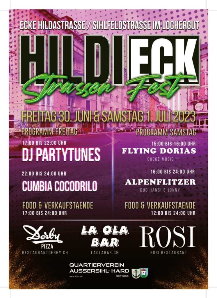 Herzlich Willkommen zum 2. Hildi-Eck Strassenfest im Hard-Quartier An der Ecke Hildastrasse/Sihlfeldstrasse – vis-à-vis Lochergut (8004) findet am Freitag, 30.6. und Samstag, 1.7.2023 das zweite HildeEck Strassenfest mit Livemusik gepaart mit Kulinarischem statt. Wir freuen uns auf Ihren Besuch. Die Veranstalter